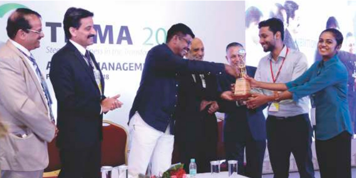 As part of TMA's management skill development initiatives for aspiring students, TMA had instituted Best Paper Presentation Award in association with KIMS Healthcare Management since 2014. This year TMA-KIMS Best Paper Presentation Award 2017 was presented by Sri. M.G. Rajamanickam IAS, Managing Director, Kerala State IT Infrastructure Ltd. to Mr. Abhijith. R and Ms. Arsha Asokan of CET School of Management, Trivandrum, joint winners of TMA-KIMS Best Paper Presentation Award 2017, at the valedictory session of TRIMA2018 held on 16th February 2018 at Vivanta by TAJ, Trivandrum.